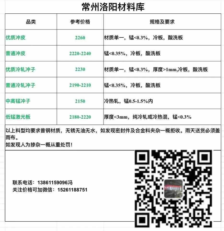 常州洛陽材料庫高價收購、自提冷板沖皮,鋼板料。收購價:優質冷板酸洗沖條沖皮最高2260,普通低錳冷板酸洗沖條沖皮2220-2240,低碳低錳沖子2190-2230,中高錳冷熱沖子2150,低錳激光板2180-2220,聯系電話13861159096馮,關注最新價格請加微信:15261188751。地址:江蘇常州武進洛陽鎮創盛路7號