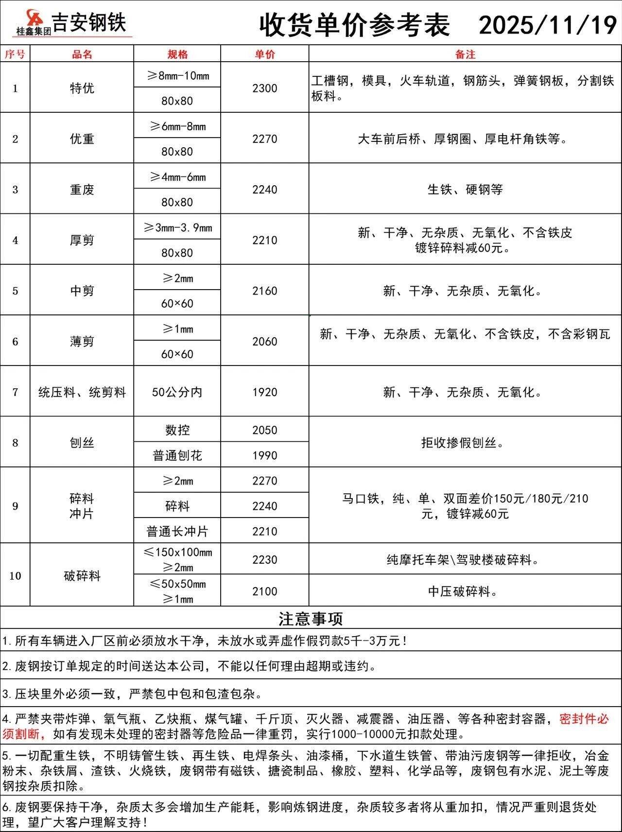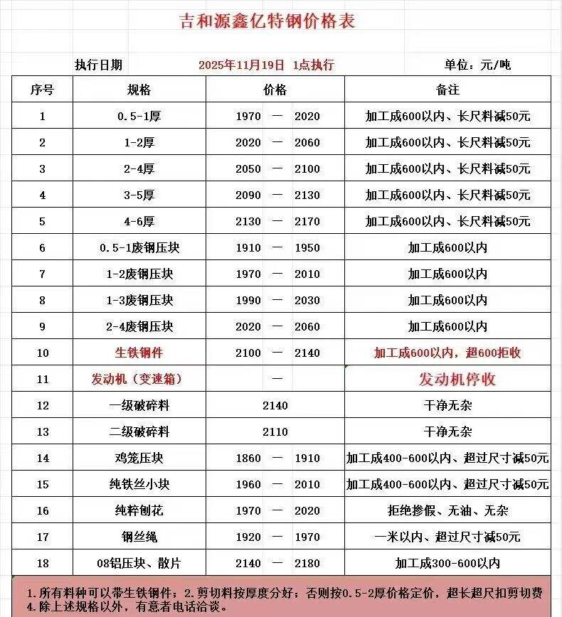 豐鎮航豐**日執行價一級重廢:****二級重廢:*****-*厚剪切料:*****-*厚剪切料:*****-*厚剪切料:*****-*厚剪切料:****鋼筋壓塊:****鐵絲、龍骨壓塊:****彩鋼瓦壓塊:停收暖氣片:****。