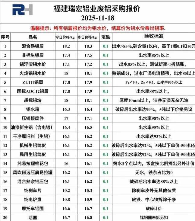 ****年**月**日福建瑞宏鋁業(yè)廢鋁采購報價