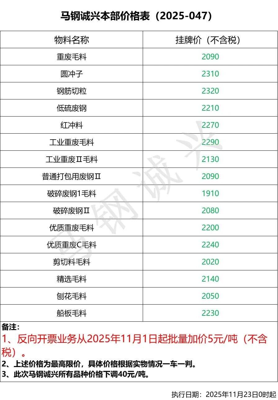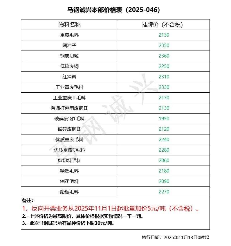 **月**日起,馬鋼誠興本部所有品種廢鋼價格下調**元/噸,調整后:重廢毛料最高****元/噸,圓沖子最高****元/噸,鋼筋切粒最高****元/噸,低硫廢鋼最高****元/噸,紅沖料最高****元/噸,工業重廢毛料最高****元/噸,工業重廢Ⅱ毛料最高****元/噸,普通打包用廢鋼Ⅱ最高****元/噸,破碎廢鋼*毛料最高****元/噸,破碎廢鋼Ⅱ最高****元/噸,優質重廢毛料最高****元/噸,優質重廢C毛料最高****元/噸,剪切料毛料最高****元/噸,精選毛料最高****元/噸,刨花毛料最高****元/噸,船板毛料最高****元/噸,以上價格不含稅。