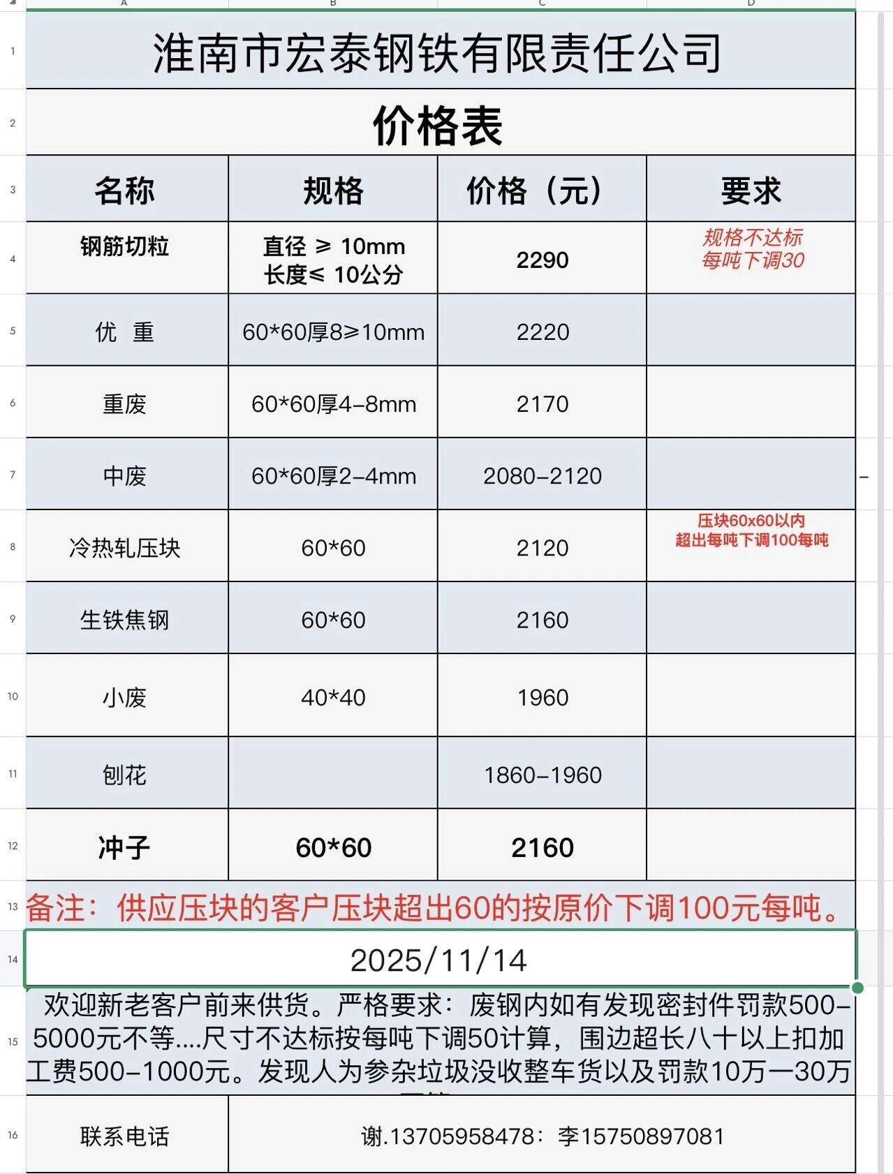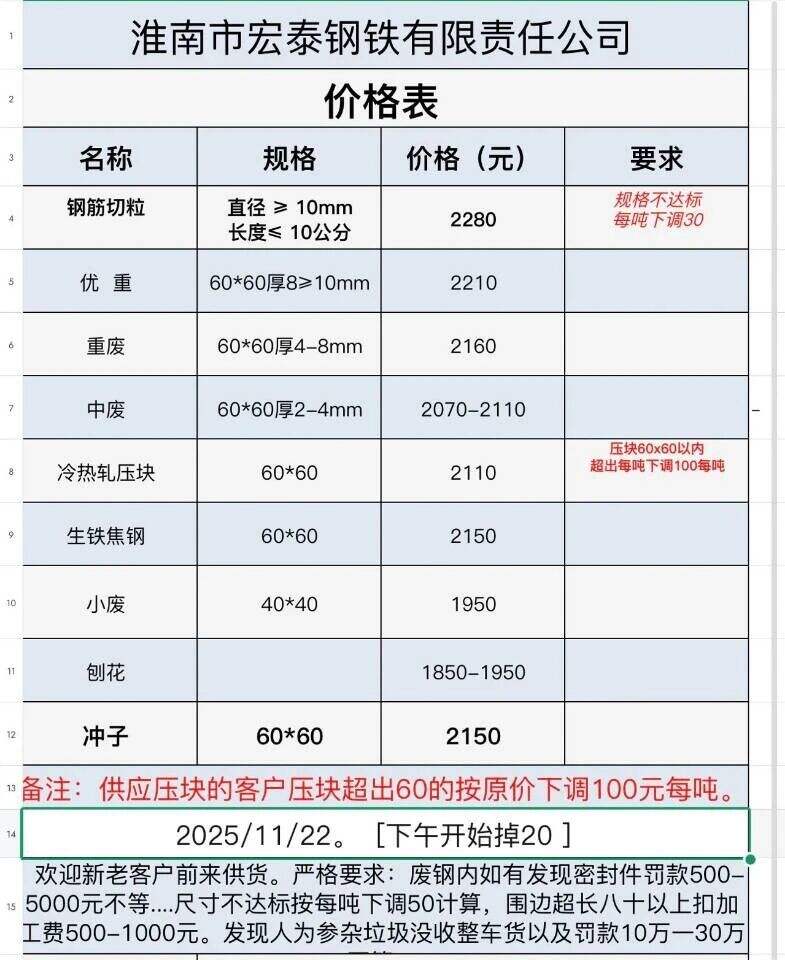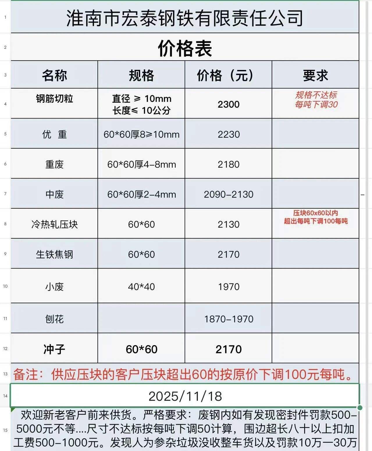 **日淮南宏泰廢鋼跌**:鋼筋切粒****,優重****重廢****,中廢****-****,冷熱軋壓塊****,生鐵焦鋼****,小廢****刨花****-****沖子****,不含稅。