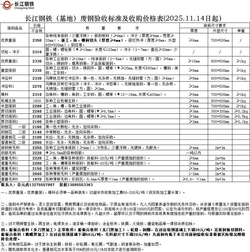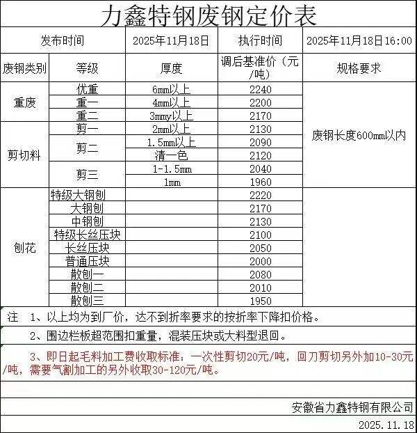 **日安徽力鑫特鋼收購價跌**:重廢****-****,剪料****-****,刨花****-****具體參考報價單,不含稅。