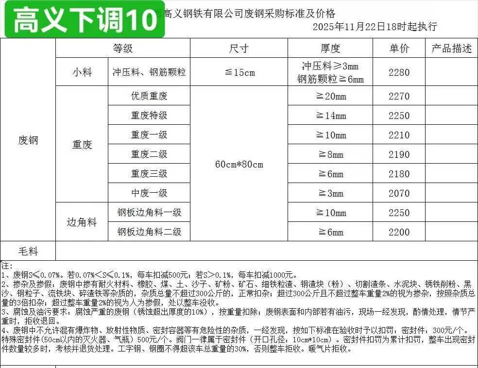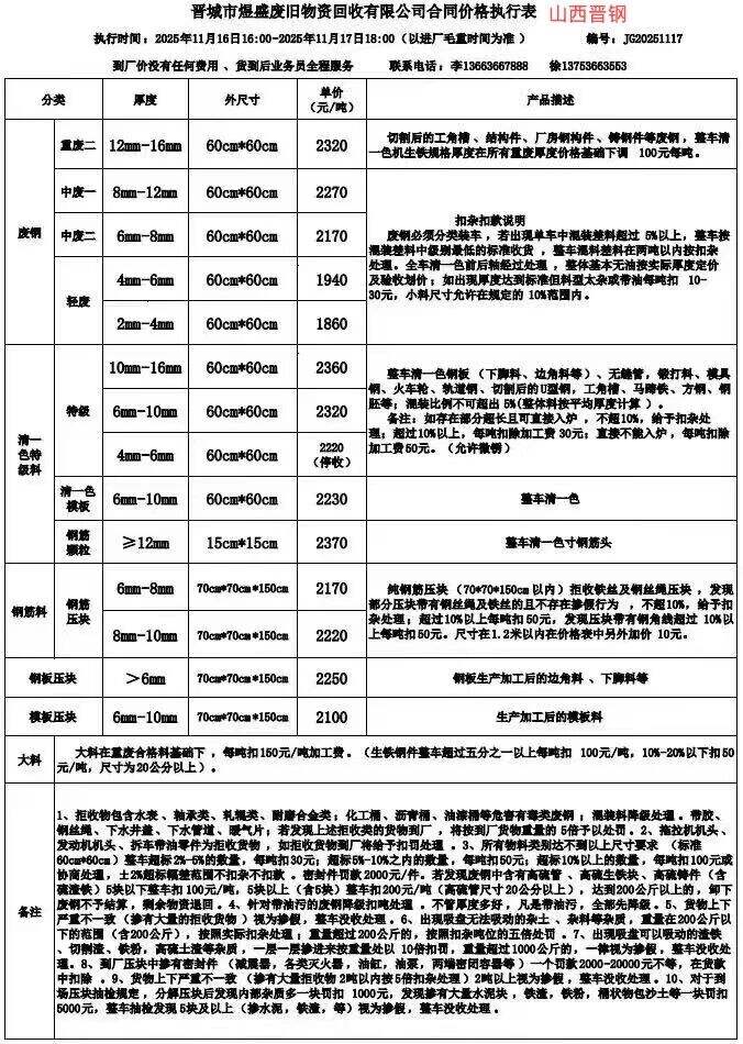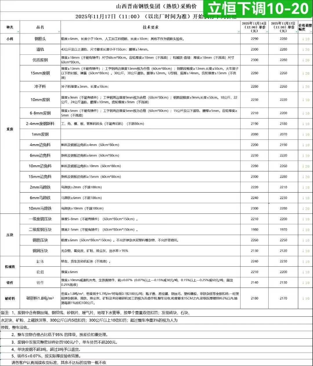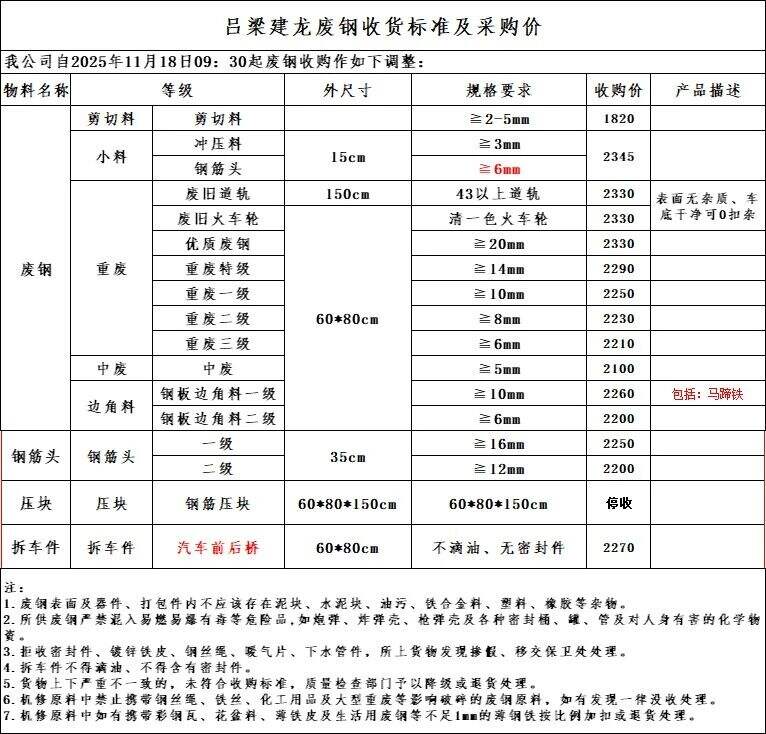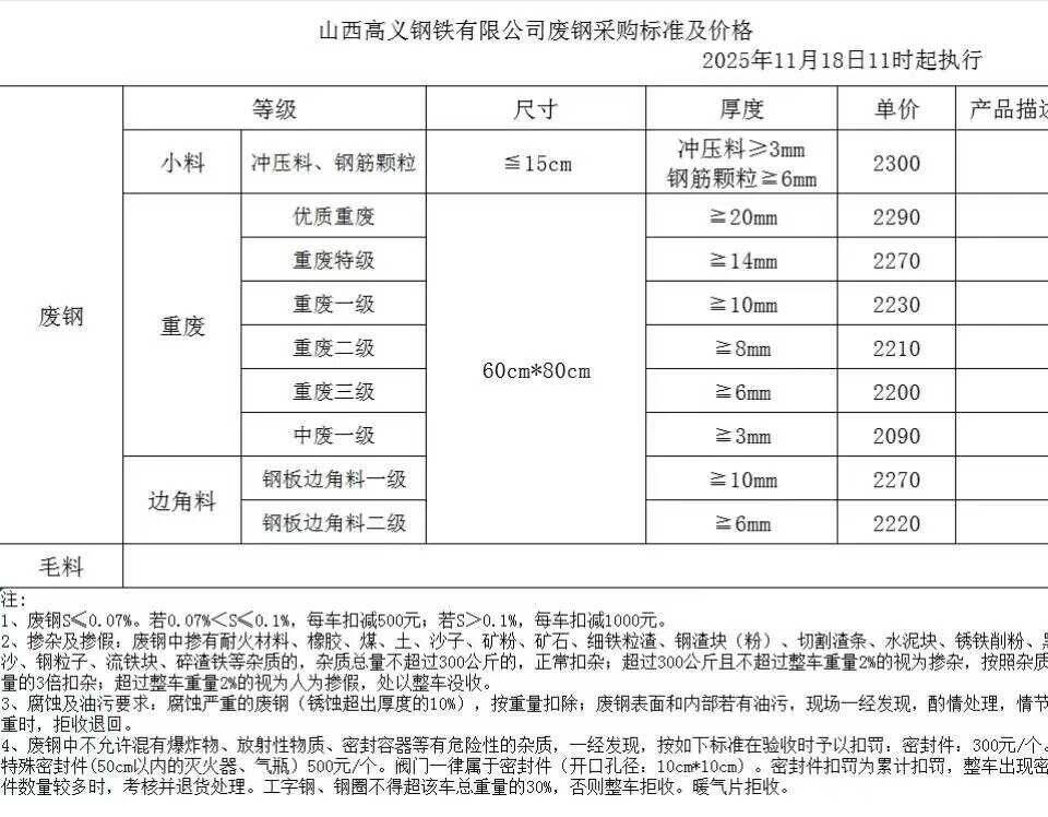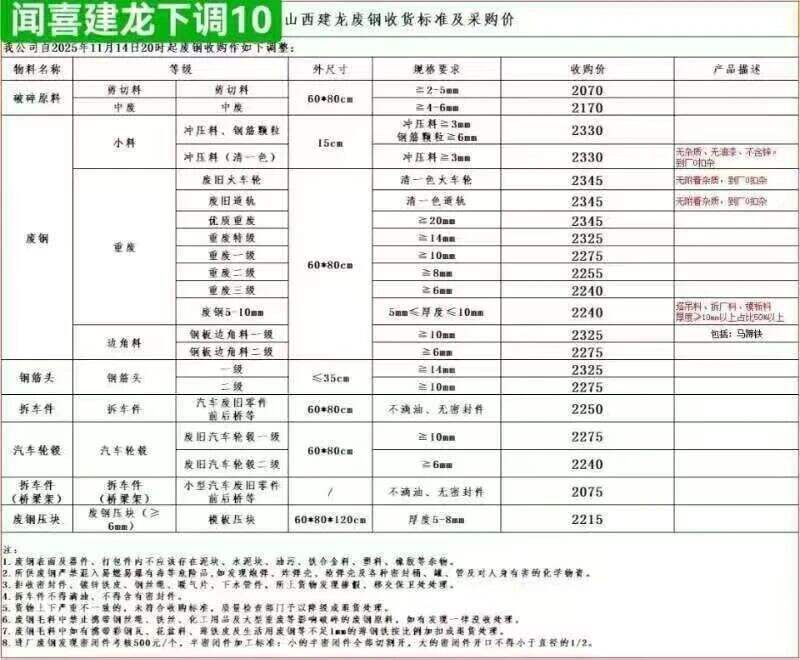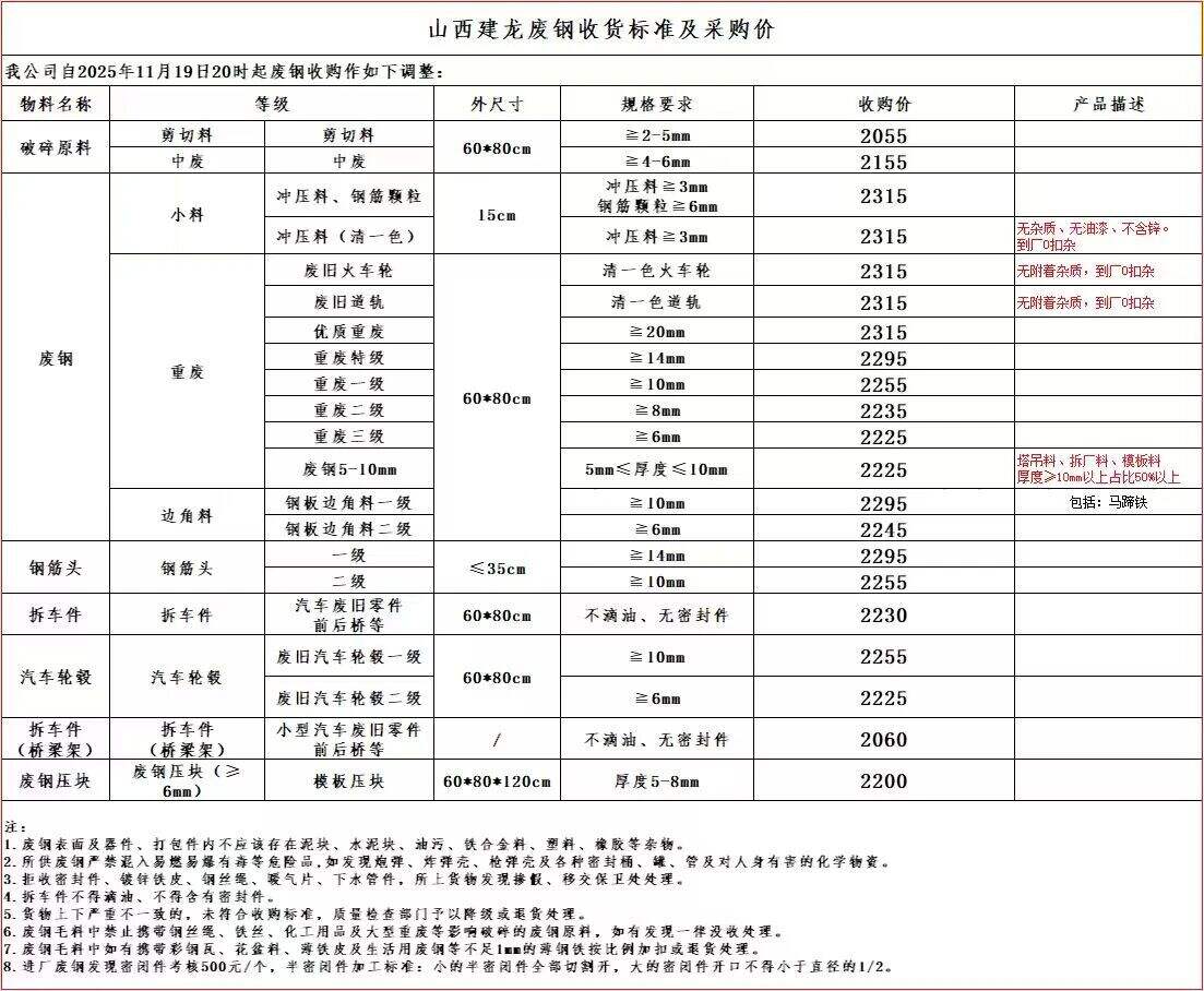 山西華鑫源鋼鐵集團(tuán)通知:****年**月**日**時(shí)起,廢鋼部分料型下調(diào)**執(zhí)行以下價(jià)格: