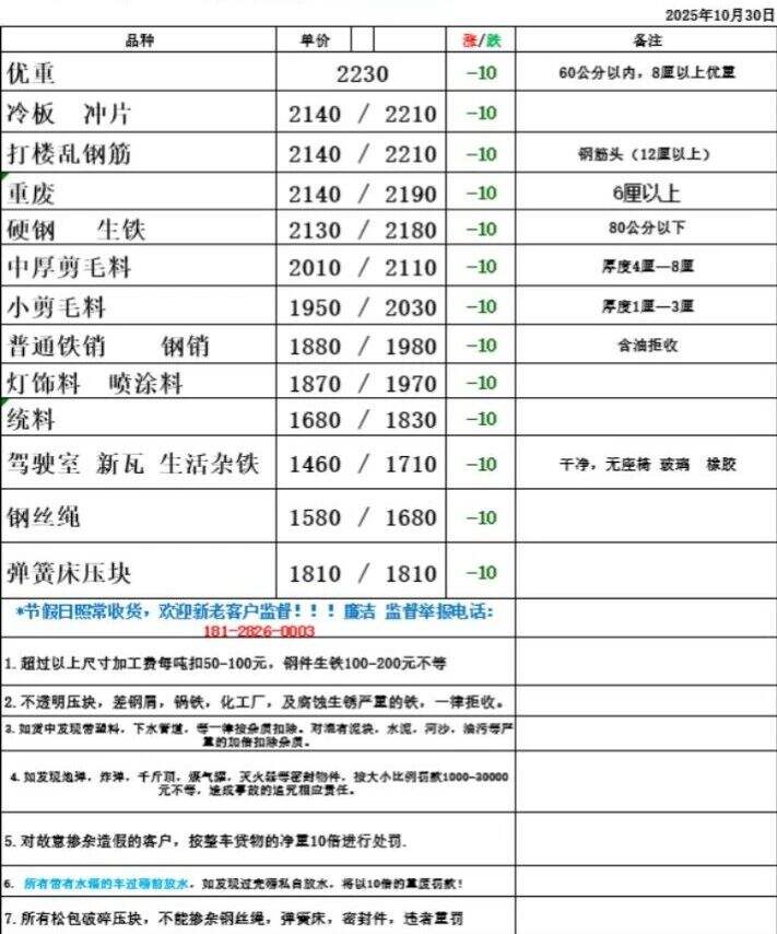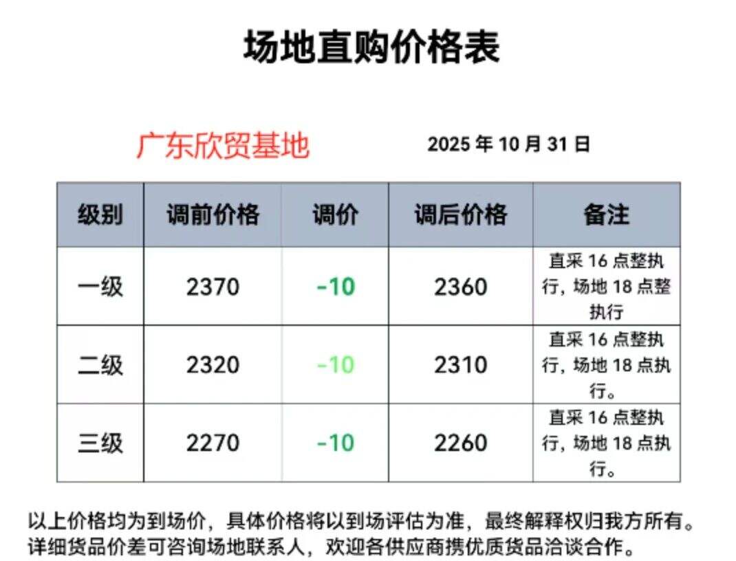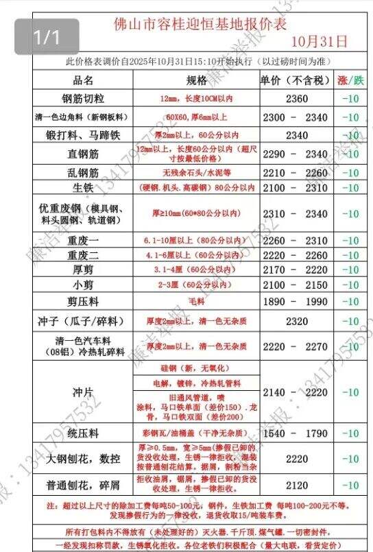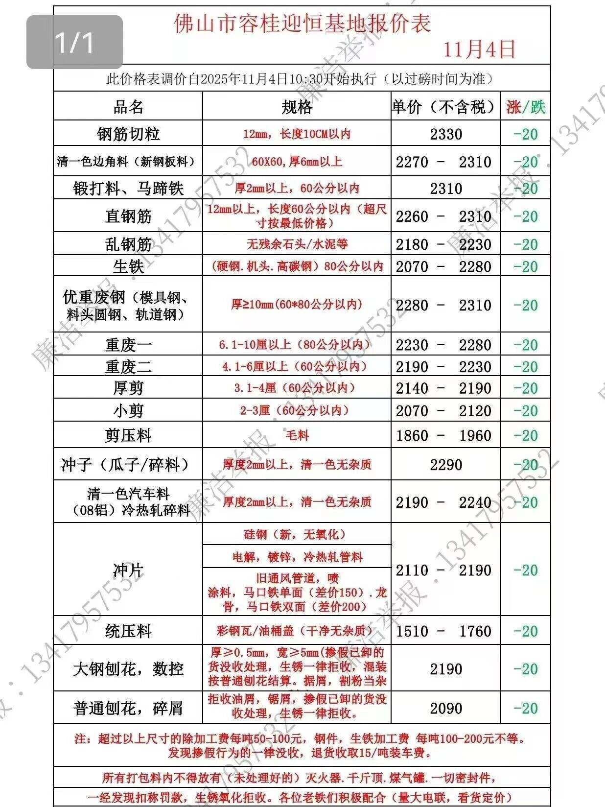 廣東欣貿基地廢鋼調價通知價差標準明細表不變。詳見價差明細表編號:XMGD-**-**直采,**點整立即執行,場地所有料型統一下調**元,**點整執行。(以上調價內容僅針對廣東區域)****年**月**日。