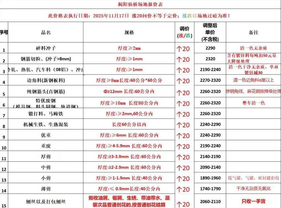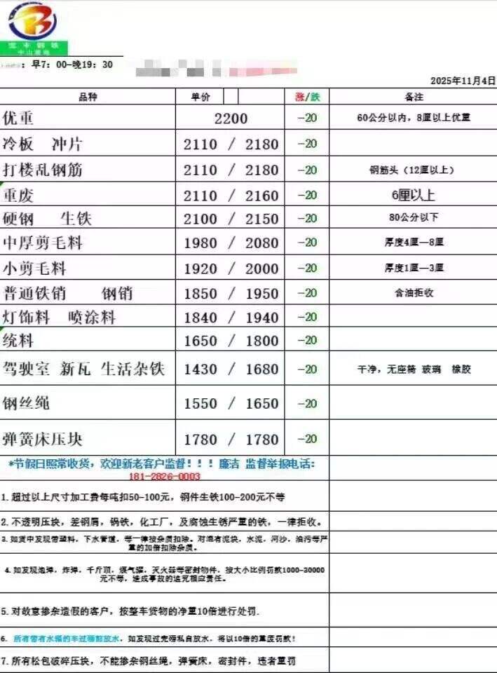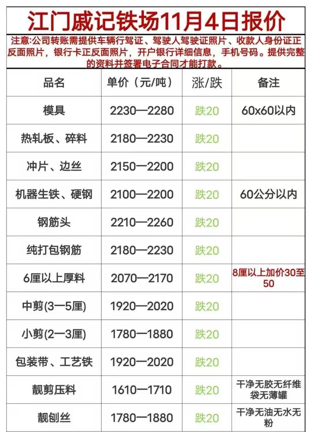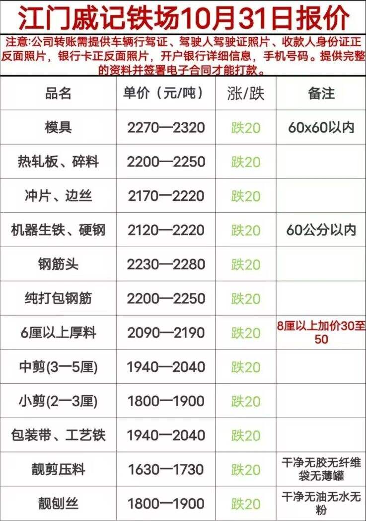 廣東欣貿基地廢鋼調價通知價差標準明細表不變。詳見價差明細表編號:XMGD-**-**直采,**點**分執行,場地所有料型統一下調**元,**點整執行。(以上調價內容僅針對廣東區域)****年**月**日。