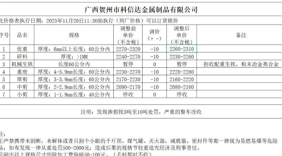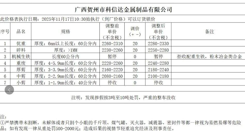 **日廣西桂鑫廢鋼跌**,最新執行價,調整后