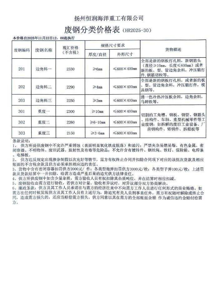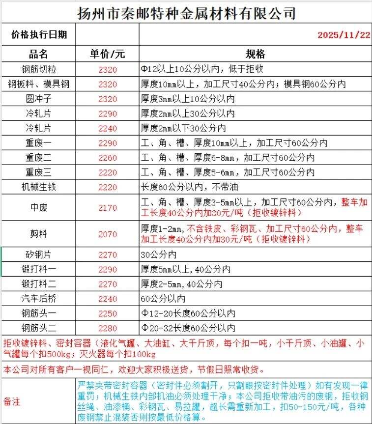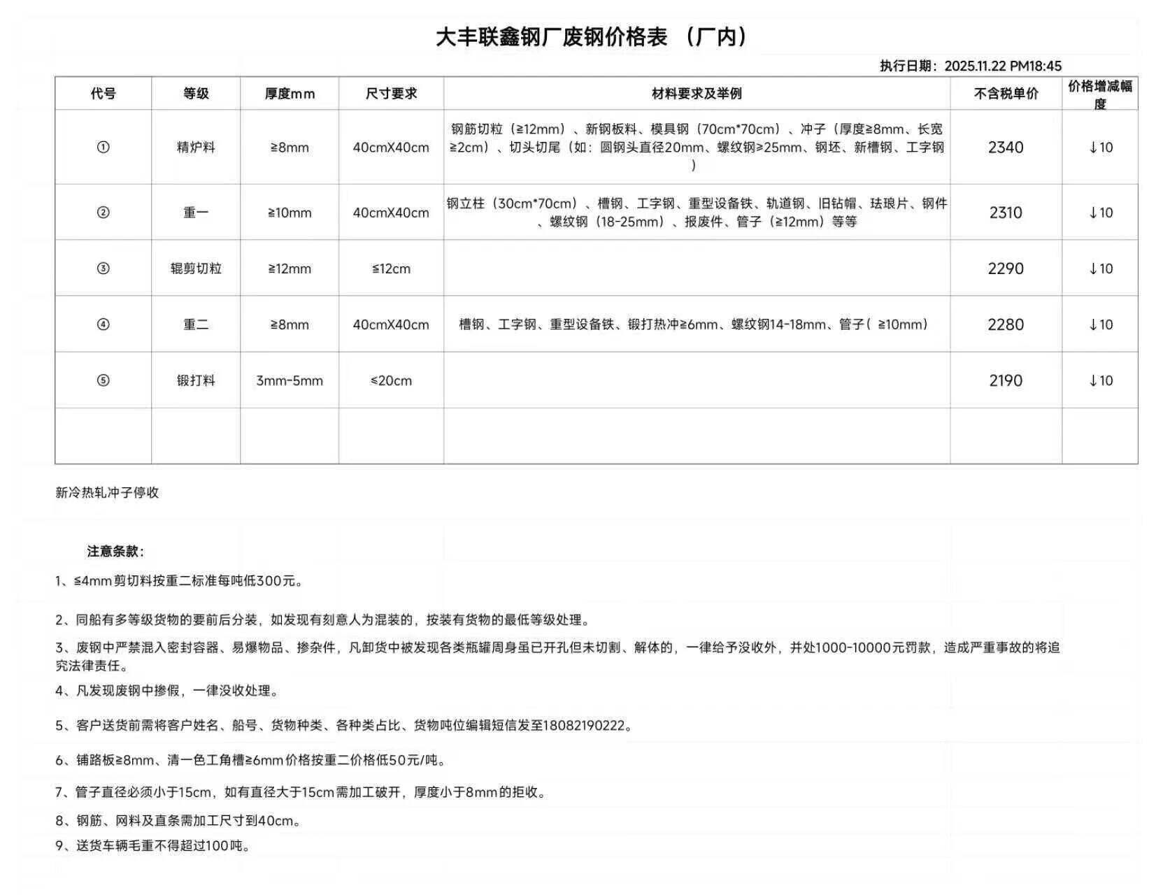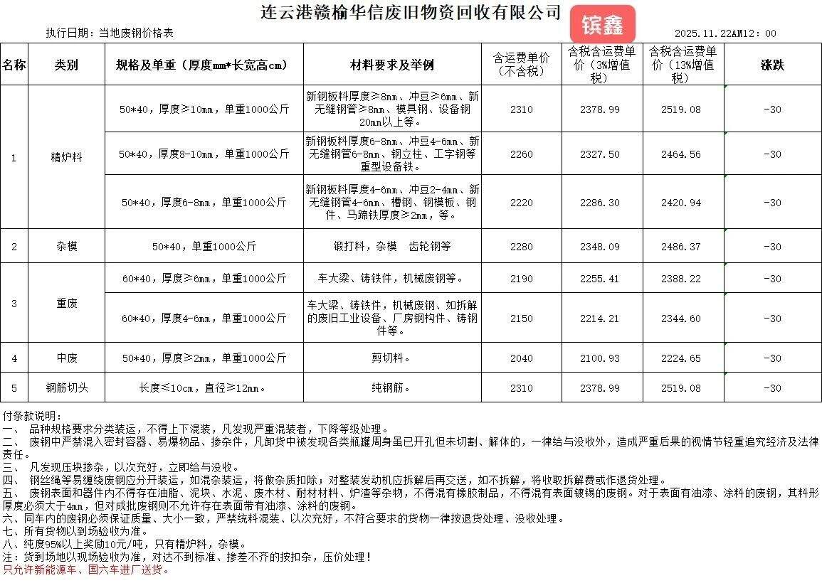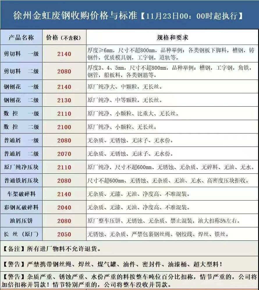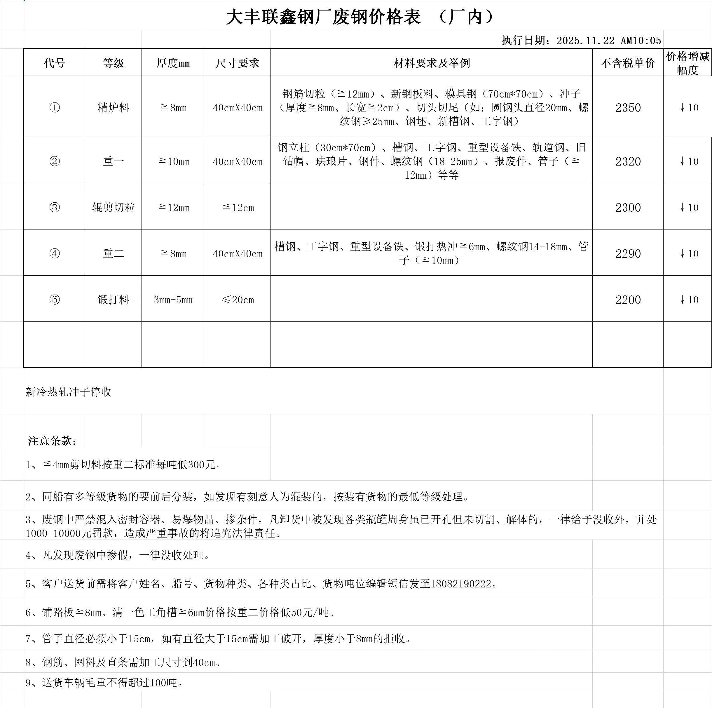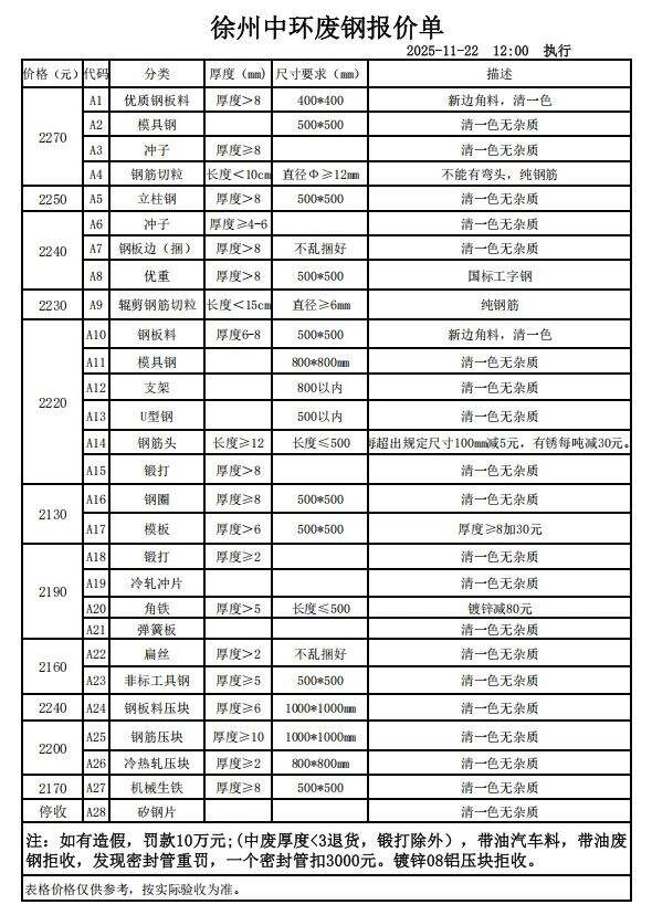 連云港亞新通知:**月**日中午**:**廢鋼價格下調**元/噸:一、**毫米厚新鋼板料,模具鋼,價****元;二、*毫米厚度以上鍛打毛邊,價****-****元;三、重廢A,價****元;四、*毫米厚重廢B,價****元;五、*毫米厚中廢新料,價****-****元。*毫米厚度以下拒收,車面與車底等級不一,按摻假處理。規格:**X**。超長度需重新加工:(*)占**%以上扣**元/噸(*)占**%以上扣***元/噸(*)化工廠料,帶油料,高硫廢鋼,油漆桶廢鋼一律拒收。所有密封容器(如:千斤頂,汽車液壓頂,各類氣瓶,罐,密封管件等),必須徹底切斷處理,如未徹底切斷,重罰*****元以上/件。