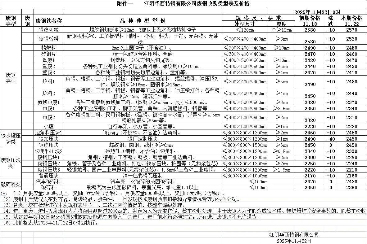 江陰華西特鋼:部分料型下調**-**元/噸。****年**月**日*時執行。(價格更正)