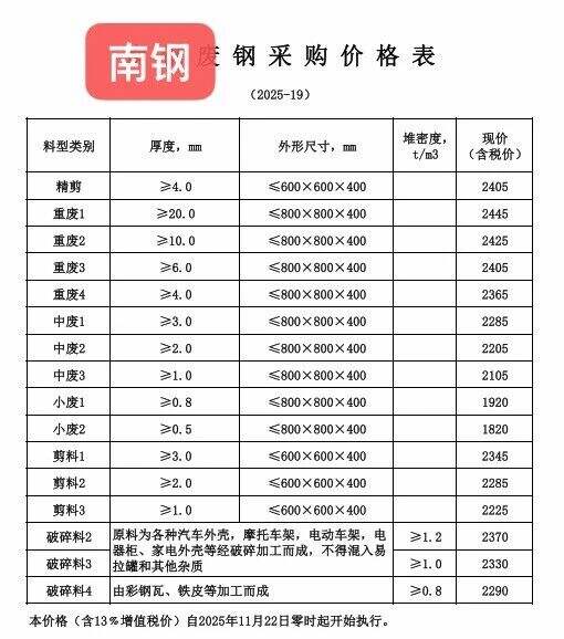 江蘇敬業基地計劃于****年**月**日**時起含稅價格:統一下調**元/噸。鋼板料(*mm)****元/噸,重廢一(**mm)****元/噸,重廢二(*mm)****元/噸,重廢三(*mm)****元/噸,次重廢(*mm)****元/噸,特級破碎料*類****元/噸。