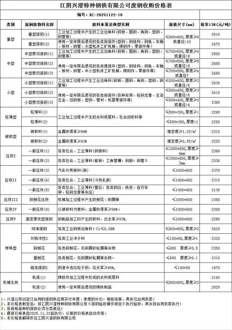 **日江陰興澄特鋼執行價,重廢一****,重廢二****,中型剪切料一****,中型剪切料二****,中型剪切料三****,小型剪切料一****,小型剪切料二****,小型剪切料三****,輕薄一****,輕薄二****,破碎料一****外購沖豆二****。含稅價。