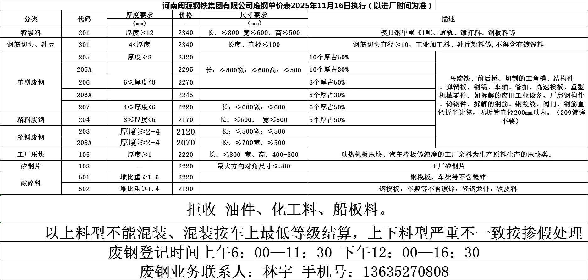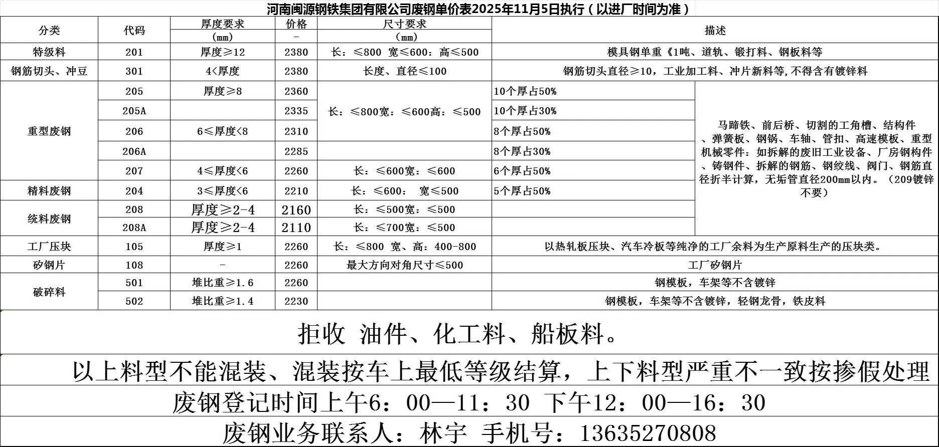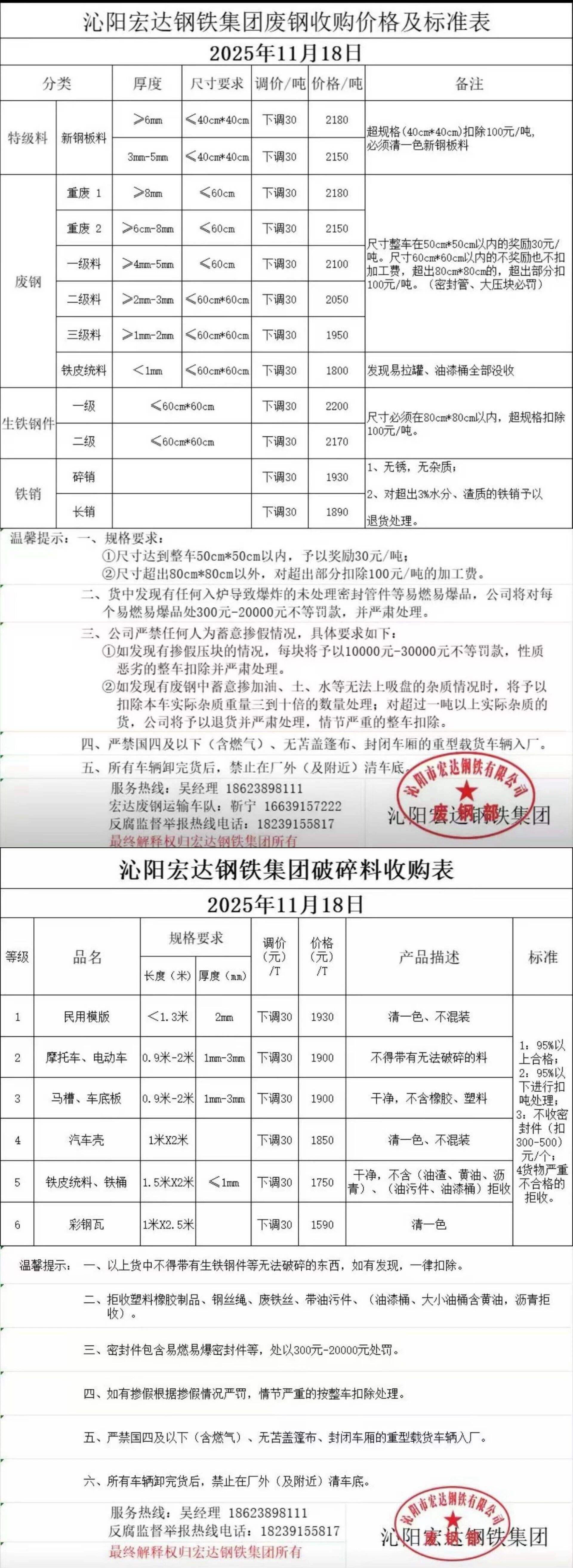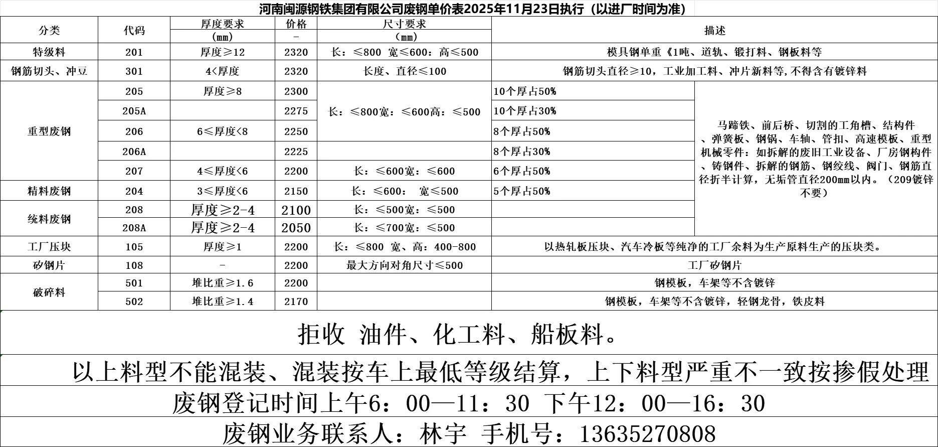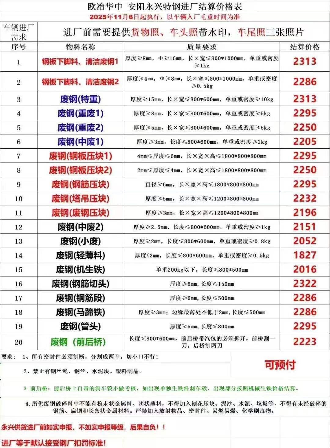 *日安陽永興特鋼廢鋼跌**:重廢一****重廢二****清潔廢鋼****-****中廢一****中廢二****小廢****輕薄料****機件生鐵****,鋼筋壓塊****,鋼筋切頭****以上價格為含**%增值稅發票價格,現匯結算。