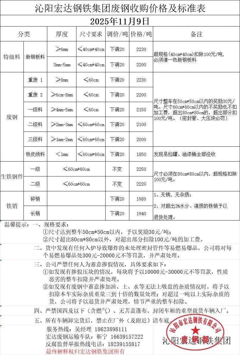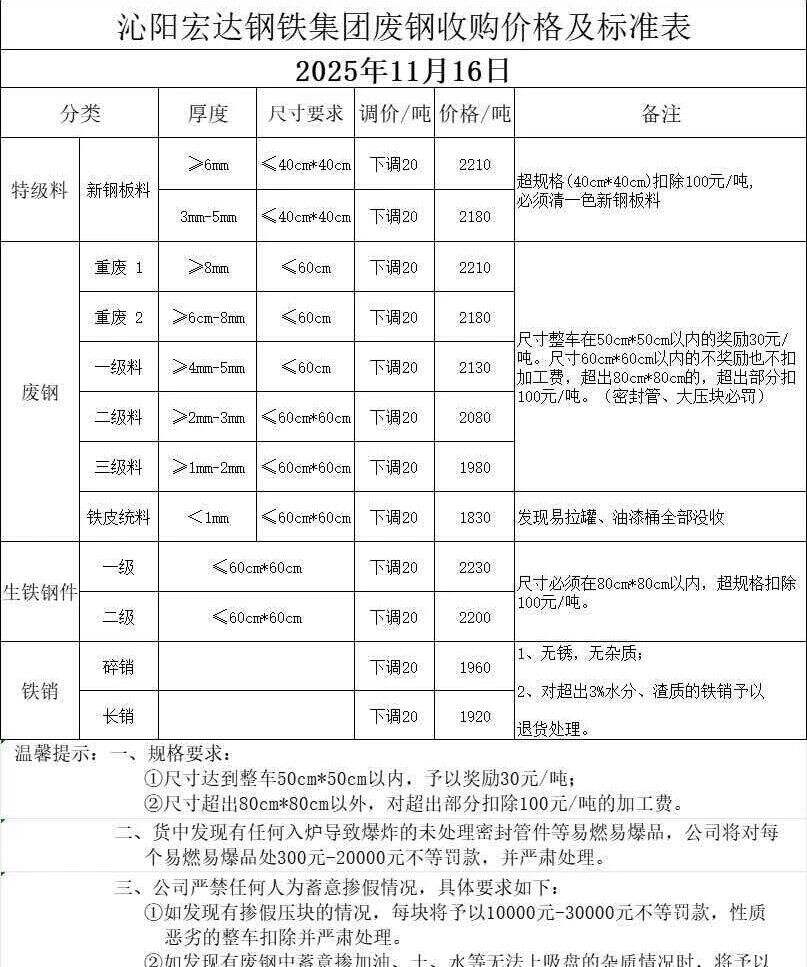 河南沁陽宏達鋼鐵集團通知:**月**日開始,整車清一色生鐵鋼件,按價格表高**元/噸(與其它廢鋼混裝的,按價格表),其它不變