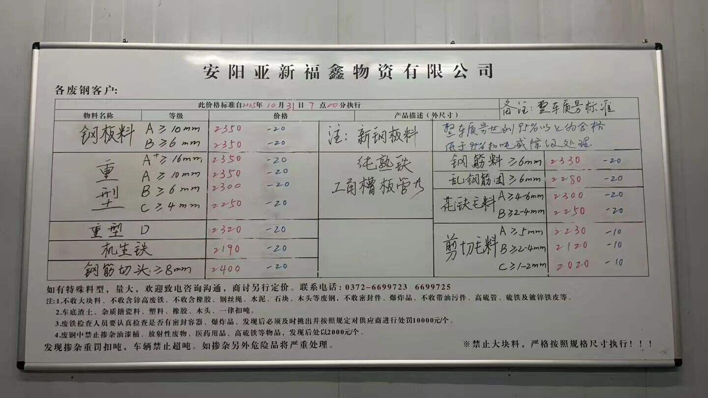 **日安陽亞新廢鋼跌**:鋼板**厚以上****,*厚以上****,特級**厚以上****,重A**厚以上****,重B*厚以上****,重型D****,機生鐵****,鋼筋切頭****,鋼筋料****,亂鋼筋團****,剪切毛料*厚****,剪切毛料*-*厚****,*-*厚****。