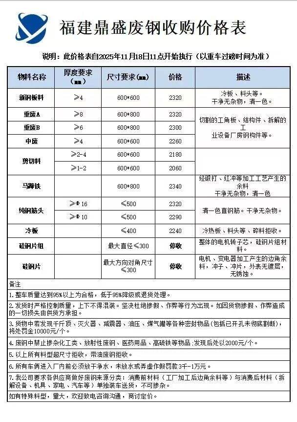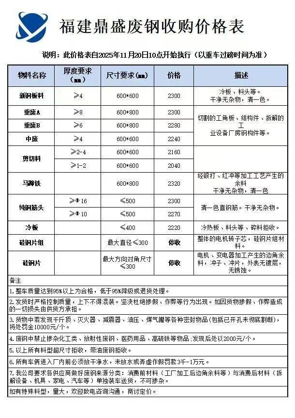 福建龍鋼對廢鋼采購價格上調**元/噸,價格調整從****年**月**日**點開始執行。