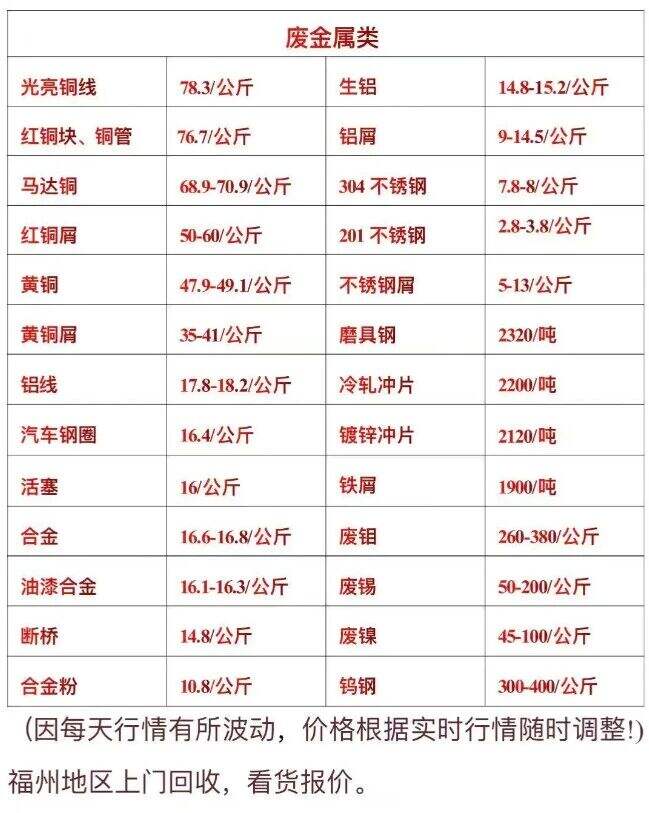 *月**日福建泉州晉江譽辰再生資源回收站今日價格: