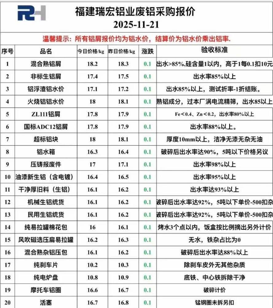 ****年**月**日福建瑞宏鋁業(yè)廢鋁采購報價